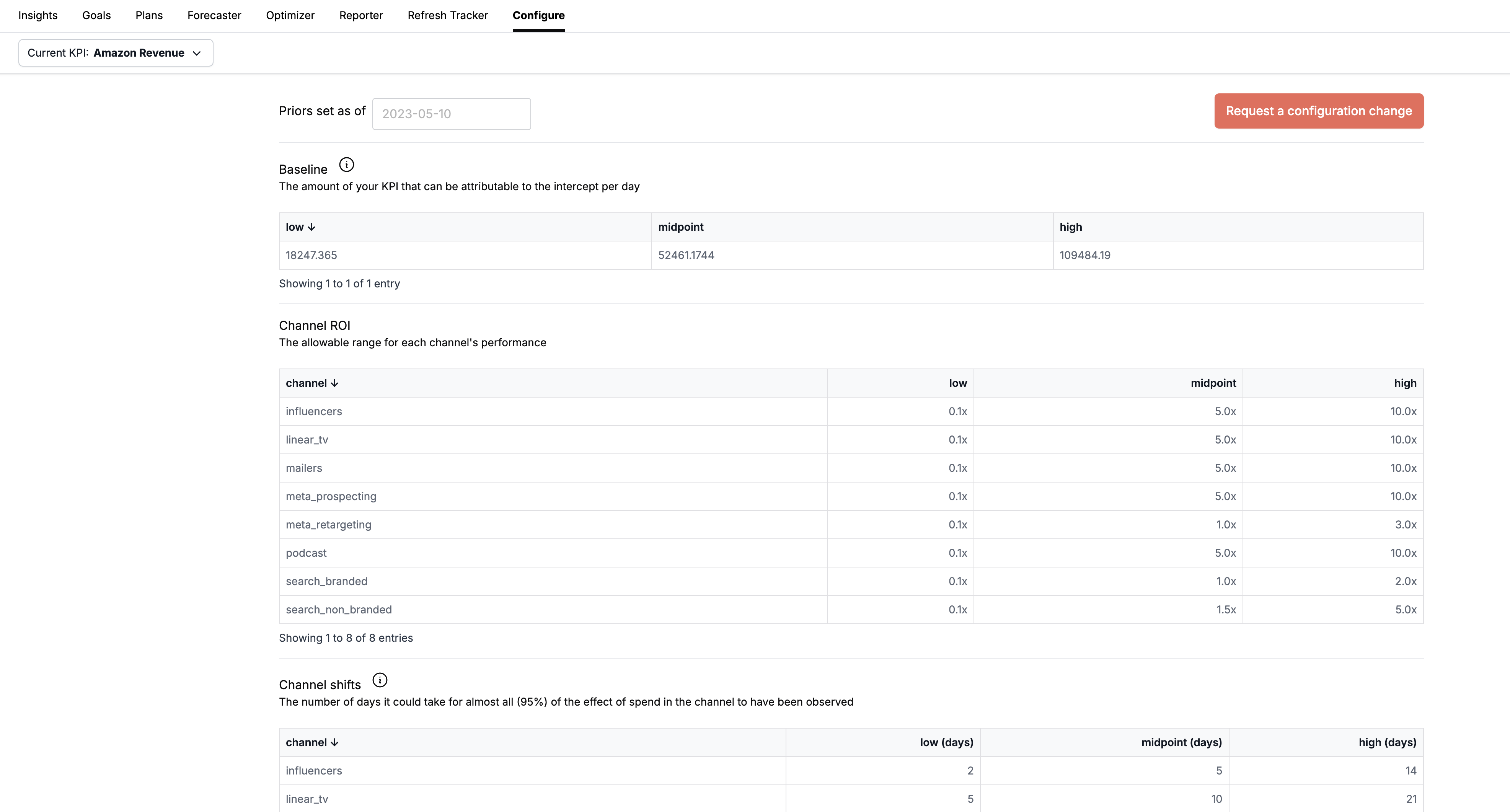 During your initial model configuration call, your customer success team would have asked you questions about your intercept and the performance and time shifts for each of your channels. These are our channel priors. They are your estimates of your business informed by your business intuition or any other existing business analytics tool you may use.