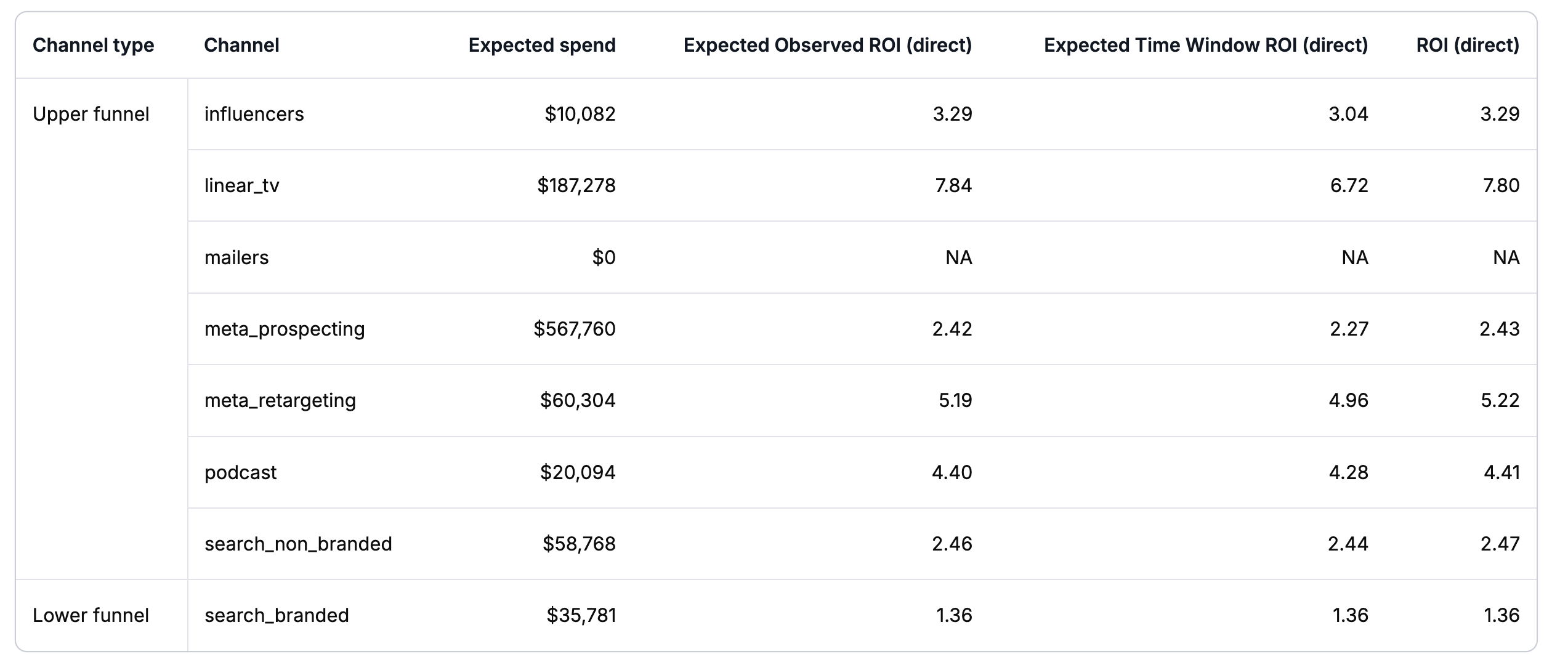 The channel summary table shows each channel, the spend, and three types of ROI estimates (defined below). The spend for upper funnel channels is what was provided in the budget. The spend for lower funnel channels depends on the setting used. If āCappedā or āUncappedā the spend is the mean expected amount of spend that would be spent if you followed the provided upper funnel budget.