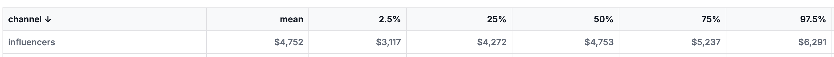 For every estimated number in Recast, there is an uncertainty distribution attached to that number made up of 500 simulated draws (Bayesian posterior samples). For high-level summary numbers in the app, we summarize this simulation with the mean, or, where appropriate, a weighted mean (for example, if we are summarizing a channelâs ROI across the week we weight the daily ROI by the amount of spend on that day) unless otherwise noted. If the number does not specify âmedianâ or some other descriptor, you can assume itâs a mean.