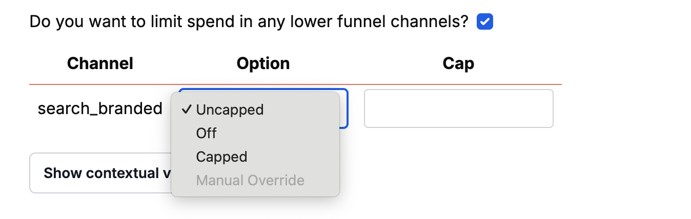 Manual Override - if you do not want to have the Optimizer control spend, you can upload a budget with the planned lower funnel spend and select “Manual Override.” This makes it so that the Optimizer will use exactly the spend you provide without any additional optimizations.