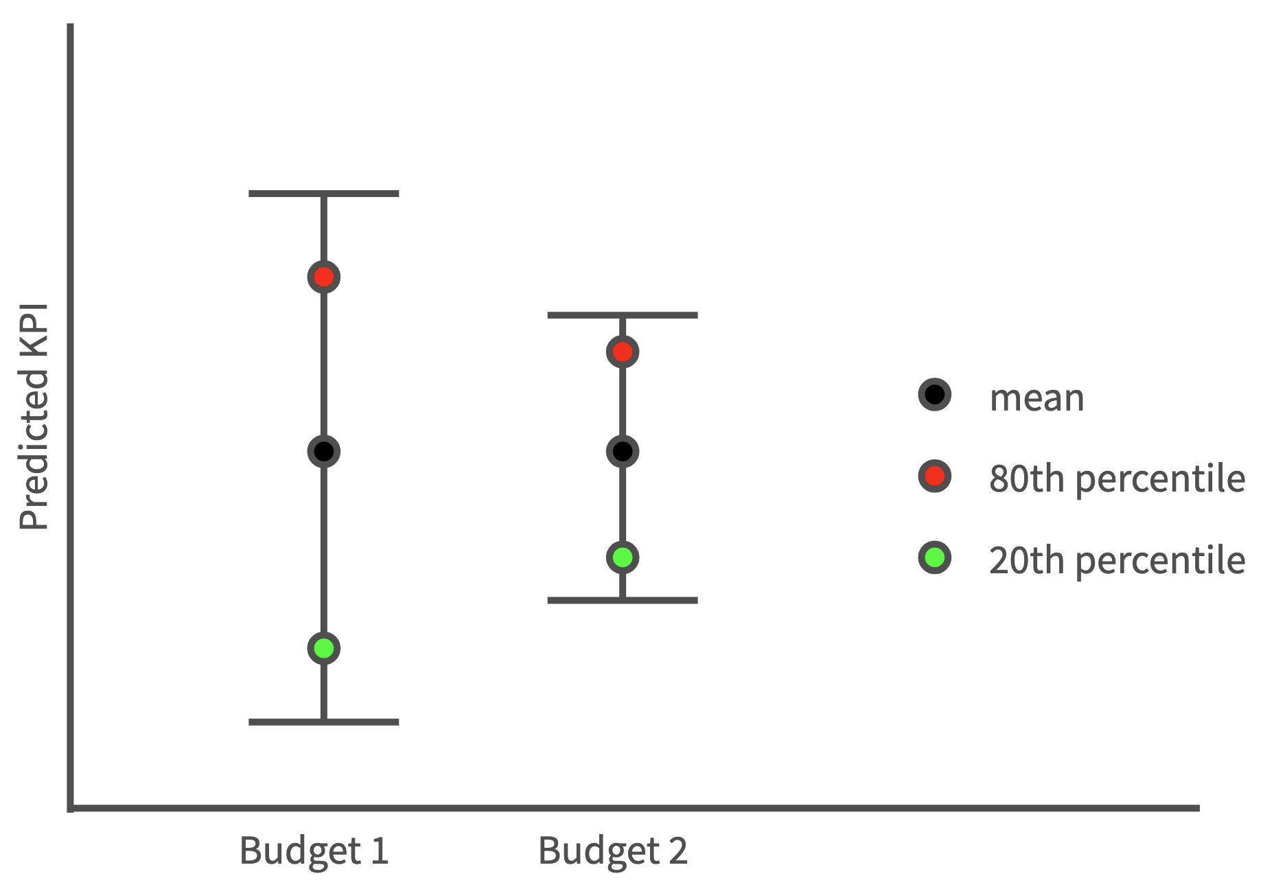 You can see that Budget 2 has a higher floor (green dot is higher than in Budget 1) but a lower ceiling (red dot is lower than in Budget 1). The Aggressive setting will prefer Budget 1, because its “best case” scenario is better than in Budget 2. But Conservative will prefer Budget 2 because its “worst case” scenario is better than in Budget 1. Base would consider these Budgets similar, because their mean predicted KPIs are similar.
